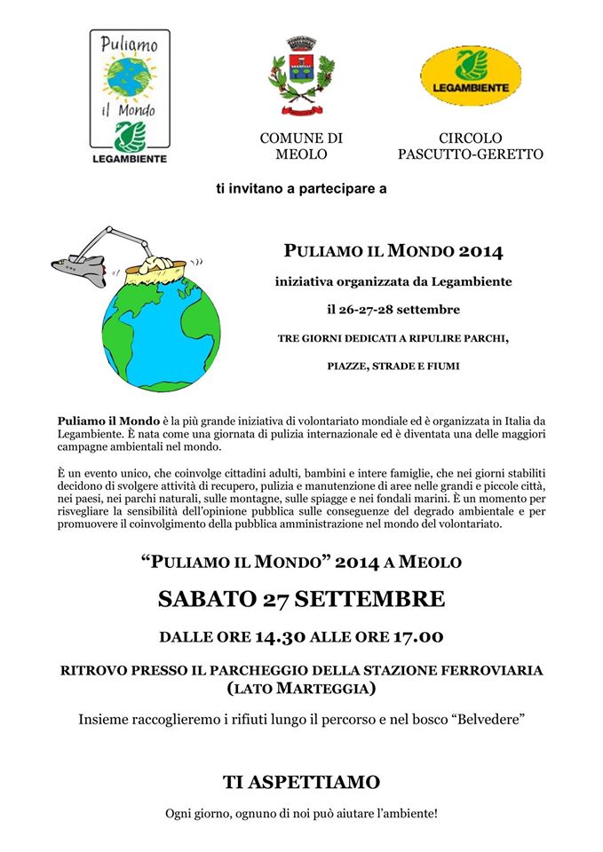 Sabato 27 settembre dalle ore 14.30 a Meolo, presso il bosco “Belvedere”, il circolo Legambiente “Pascutto-Geretto” del Veneto Orientale, nell’ambito dell’iniziativa internazionale “Puliamo il mondo”, promuove con la collaborazione dell’Amministrazione Comunale un’azione di conoscenza e sensibilizzazione verso l’ambiente e i rifiuti. L’iniziativa avrà come punto di ritrovo il parcheggio della stazione ferroviaria di Meolo, lato sud verso Marteggia, luogo dal quale i volontari e i cittadini si muoveranno verso il bosco “Belvedere” al fine di ripulire sia lungo il percorso che l’area interessata dal bosco stesso.